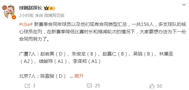 CBA有5队有多达11人处在合同年,分别是上海、同曦、深圳、江苏与宁波;有2队有9人处在合同年,分别是山东与四川;有3队有8人处在合同年,分别是北控、天津与吉林;有4队7人处在合同年,分别是浙江、广厦、北京与广州等。