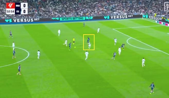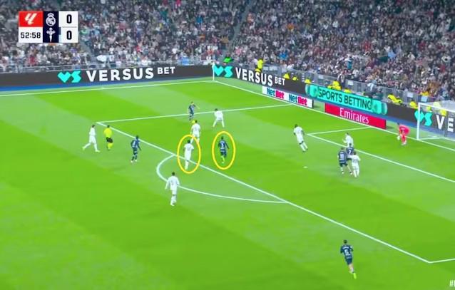 居莱尔最终选择上抢明格萨,却被对方轻松摆脱。明格萨凭借对比赛的理解,通过内收位置进一步利用了皇马的弱点。伊格莱西亚斯在楚阿梅尼身后接应,迫使后者必须压出去面对明格萨。