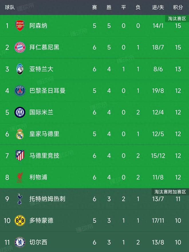 欧冠第6轮结束了9场比赛,最新积分榜如下!